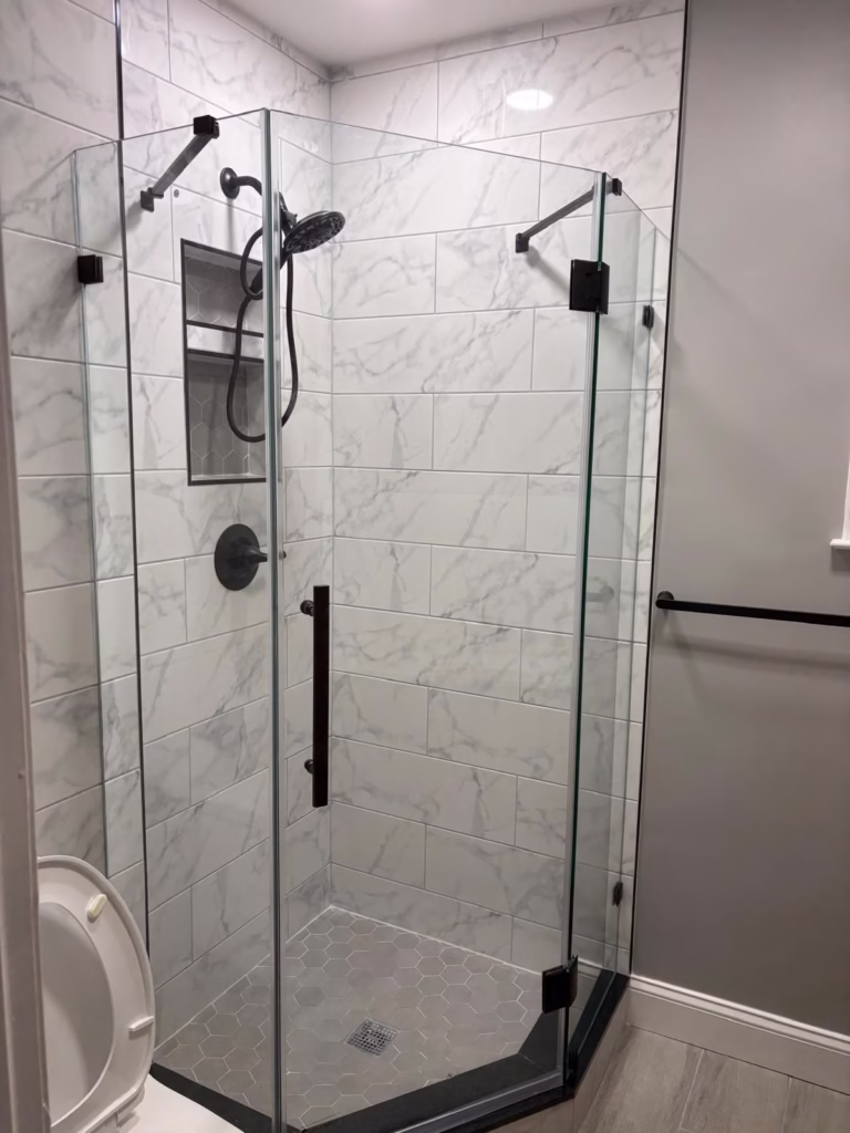 A new shower base was built to provide a stable and long-lasting foundation for the tiled shower system. To complement the base, a polished engineered marble threshold was installed at the shower curb, adding a refined transition detail and enhancing durability.