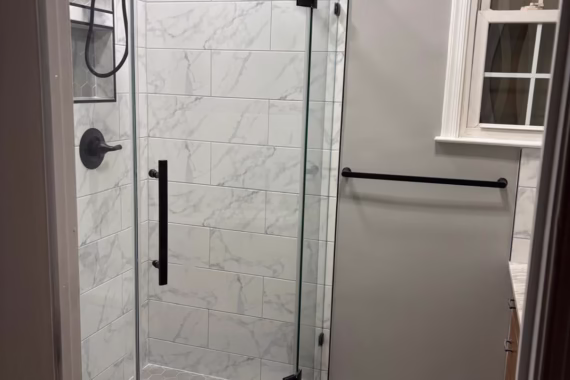 New shower doors were installed to enclose the space, creating a clean, modern look while helping contain water within the shower area.
