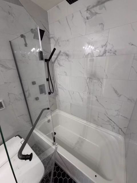 The bathtub area was fully tiled up to the ceiling using polished marble-look porcelain tile, creating a seamless and luxurious appearance while providing superior moisture protection. Matching tile was installed throughout the bathroom walls up to the ceiling, enhancing visual height and delivering a cohesive, high-end finish.