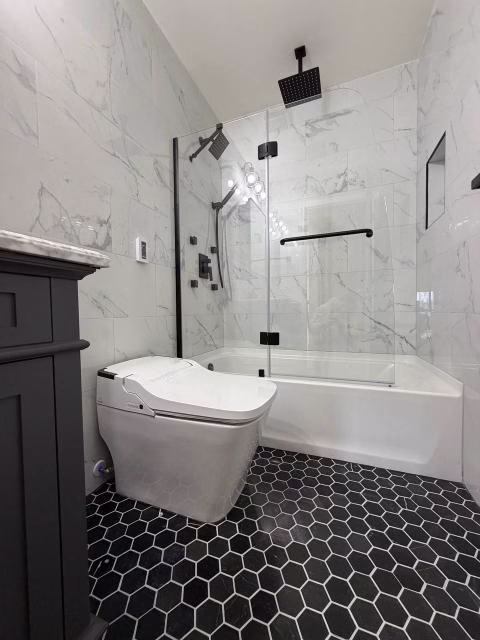 BMR Belmax Remodeling recently completed a full guest bathroom renovation in Langhorne, Pennsylvania, transforming an outdated space into a bold, modern bathroom designed for comfort, durability, and everyday practicality. This project combined structural preparation, high-end tile installation, upgraded plumbing fixtures, and modern electrical enhancements to create a visually striking and highly functional guest bathroom.