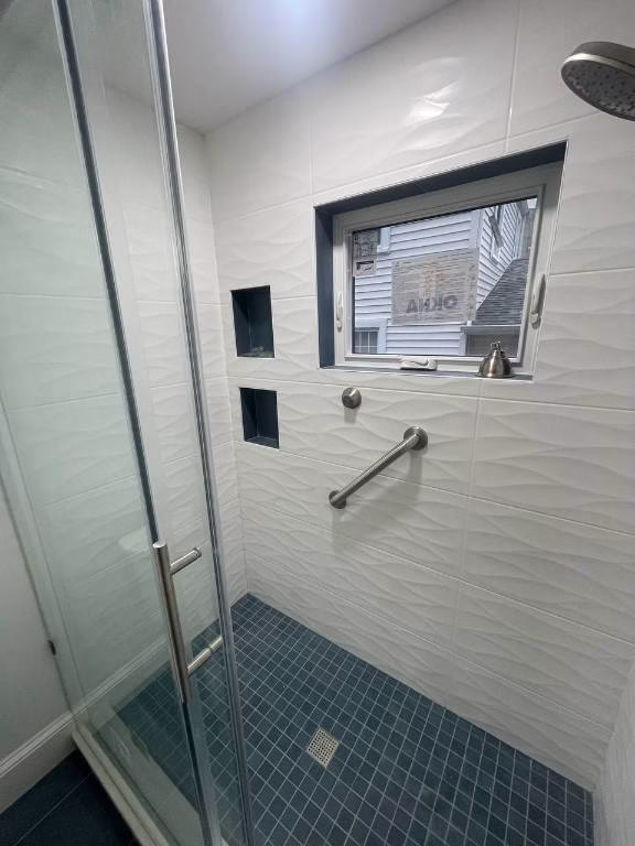 The shower walls were tiled from floor to ceiling to enhance visual height while providing full moisture protection. The shower base was finished with durable, slip-resistant tile for safety and long-term performance. Two grab bars were installed inside the shower area to provide additional support without compromising the clean design.