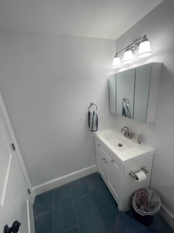 Floor tile was installed throughout the bathroom with careful alignment to ensure a seamless appearance. The vanity area was upgraded with the installation of the homeowner’s selected vanity, along with a new faucet and a medicine cabinet with integrated mirror.