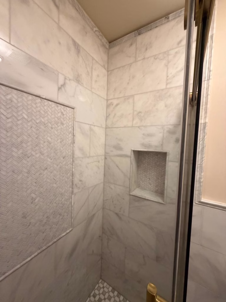 To create a distinctive design feature, mosaic tiles were installed on the back shower wall as an accent element, adding depth and visual interest to the space. A recessed niche was also installed within the shower area to provide convenient storage while maintaining a clean and streamlined appearance.