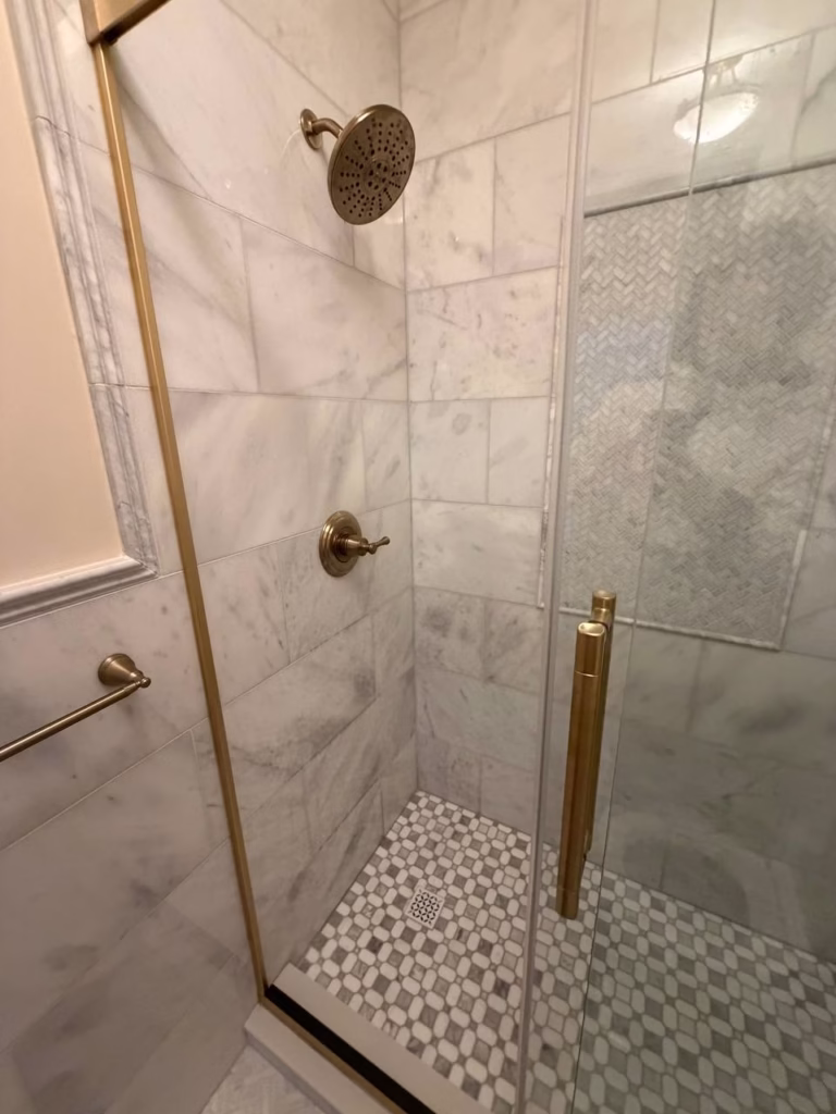 The enclosure was completed with the homeowner’s sliding glass shower doors and selected shower faucet, combining modern aesthetics with dependable performance.