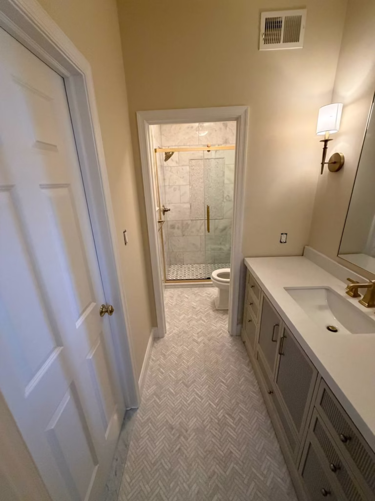 A new single-sink vanity was installed, and as part of this upgrade, the drain and water supply lines were relocated to properly support the updated layout. The vanity installation included a new faucet and sink, along with a medicine cabinet or mirror positioned above for practical storage and visual balance.